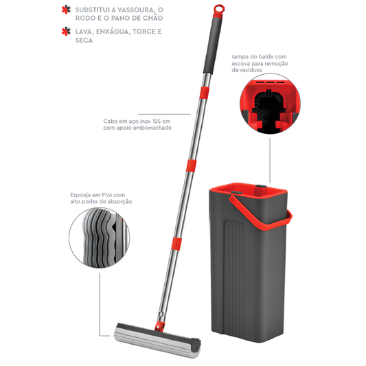 Mop Esponja Pro Retrátil Limpeza Geral com Balde Rodo Mágico 1,25m
